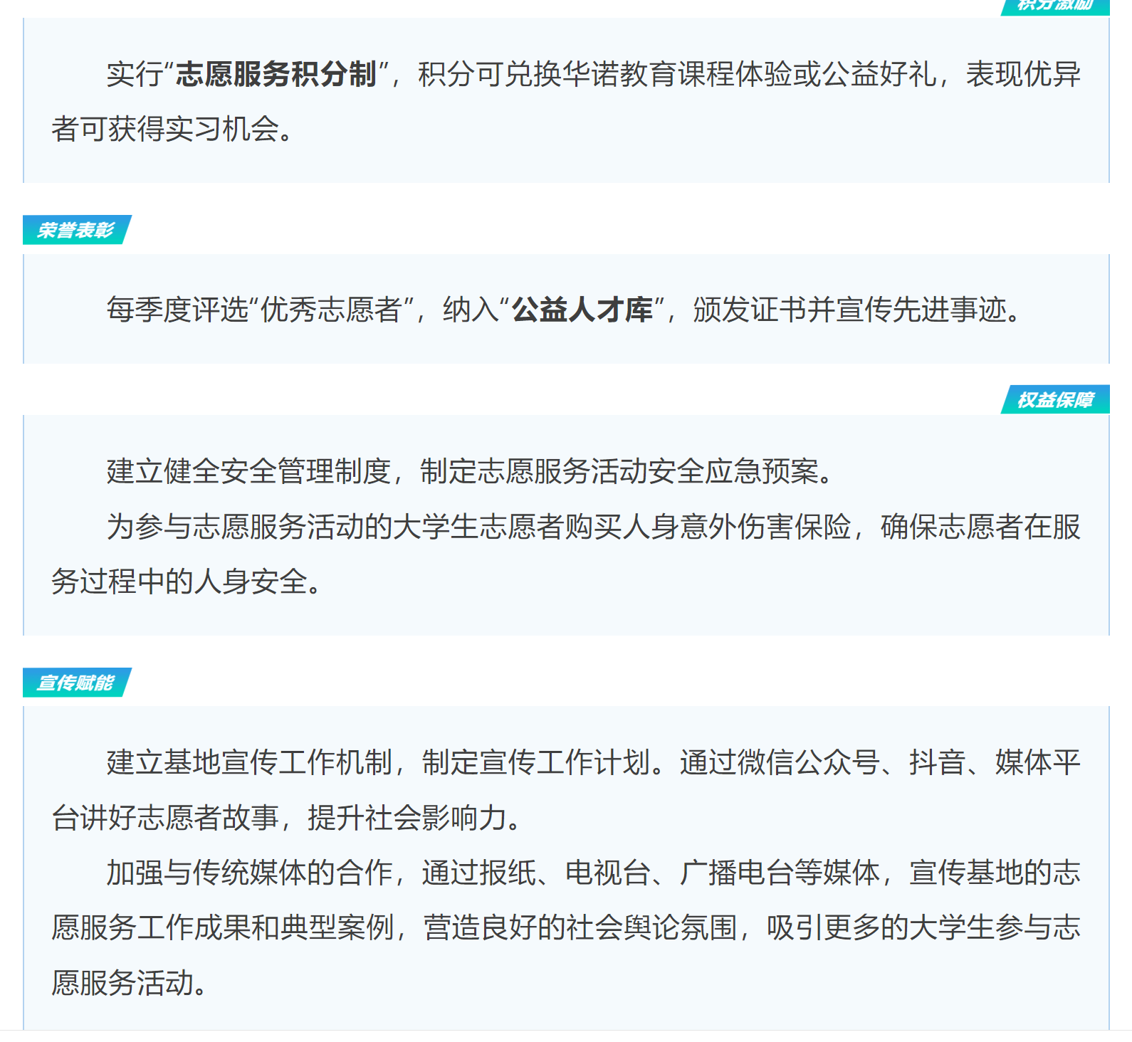 基地以“服务育人、项目拓展、品牌打造、长效发展”为目标,致力于构建集志愿服务、能力培养、项目孵化、人才输送于一体的综合性公益平台。