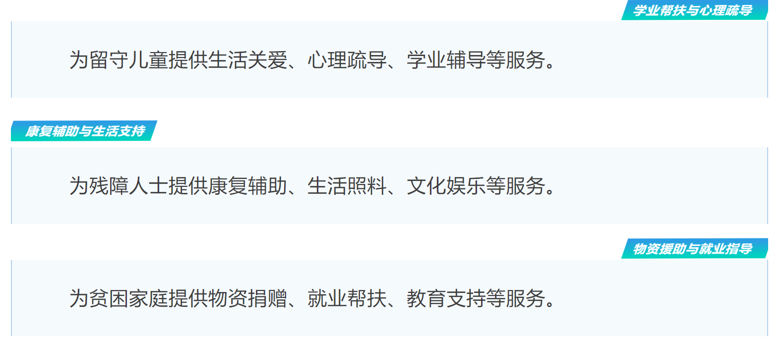 聚焦留守儿童、残障人士、困难家庭,关注社会弱势群体,提供: